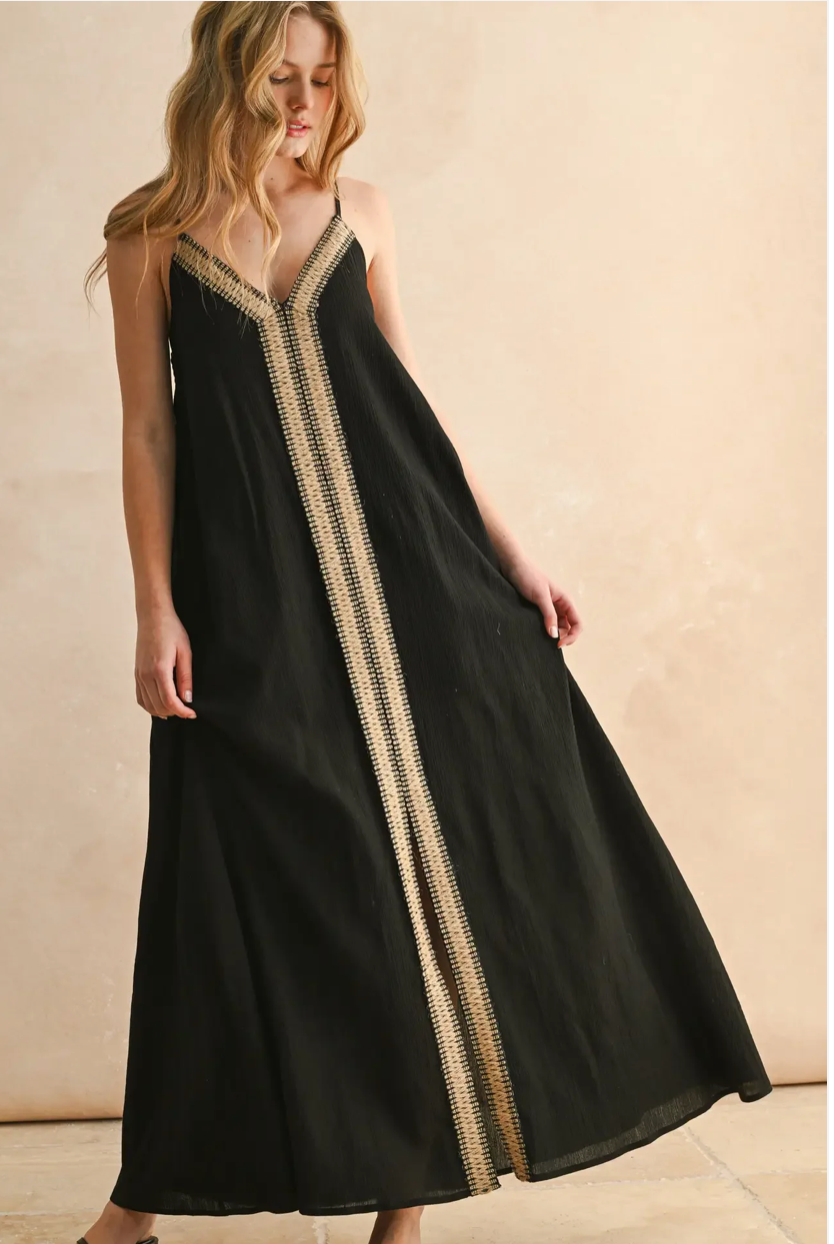 Slip into the Aruba Maxi, where comfort meets charm! This black cotton maxi dress features adjustable straps for the perfect fit and playful straw piping details that add a touch of whimsy. Designed bra-friendly, it keeps you feeling free and fabulous all day long. Perfect for sunny days or casual nights out!