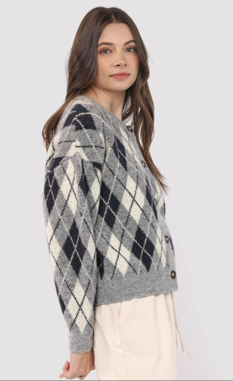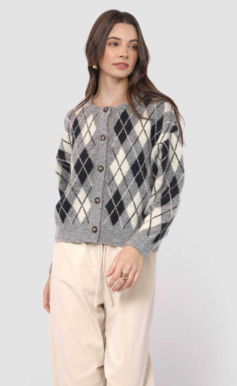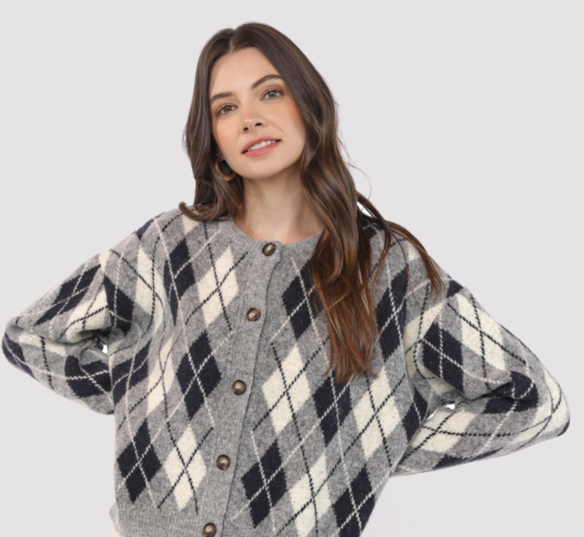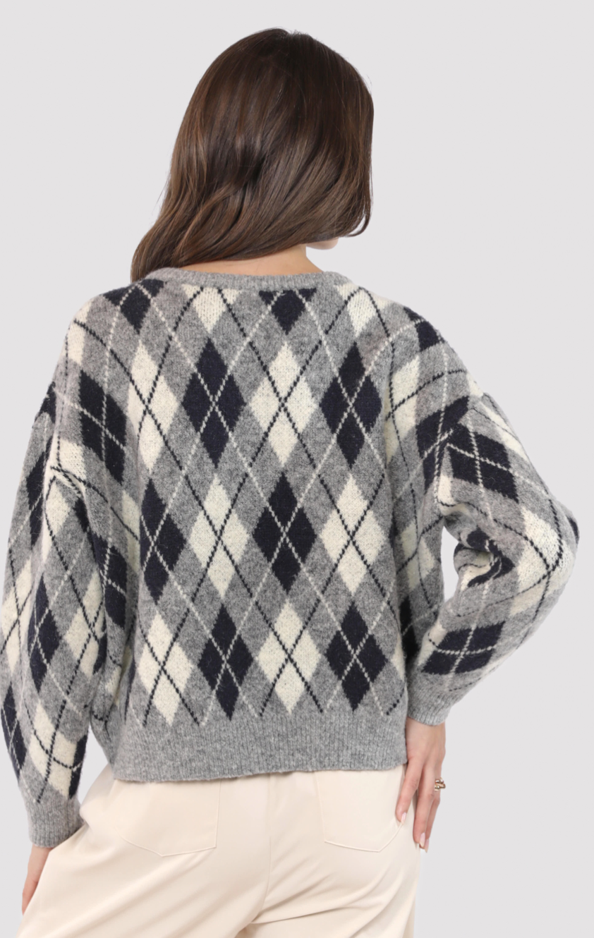 Cozy up in the Bec Sweater, where classic grey and black argyle patterns meet a fun, playful vibe. Perfect for adding a little charm to chilly days, this sweater brings timeless style with a wink. Whether you're out with friends or lounging at home, it’s your go-to for warmth and personality.