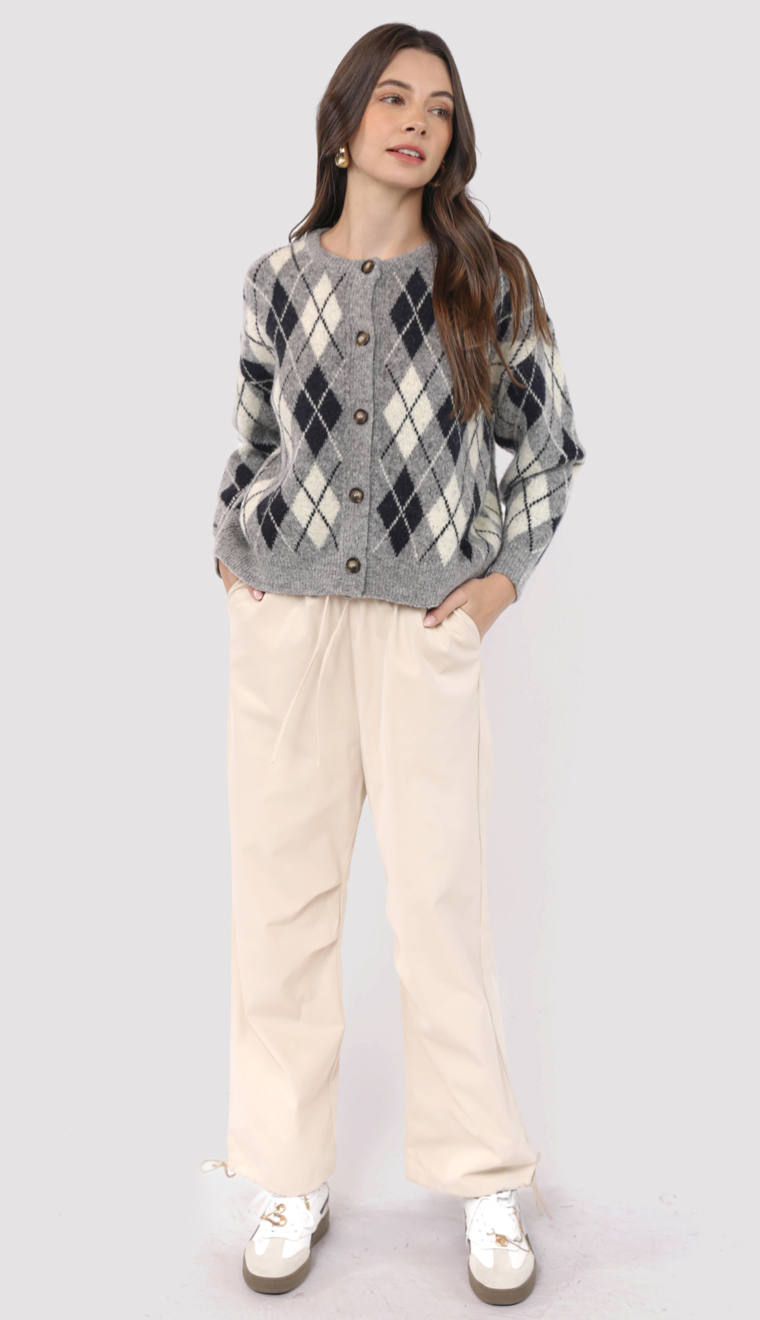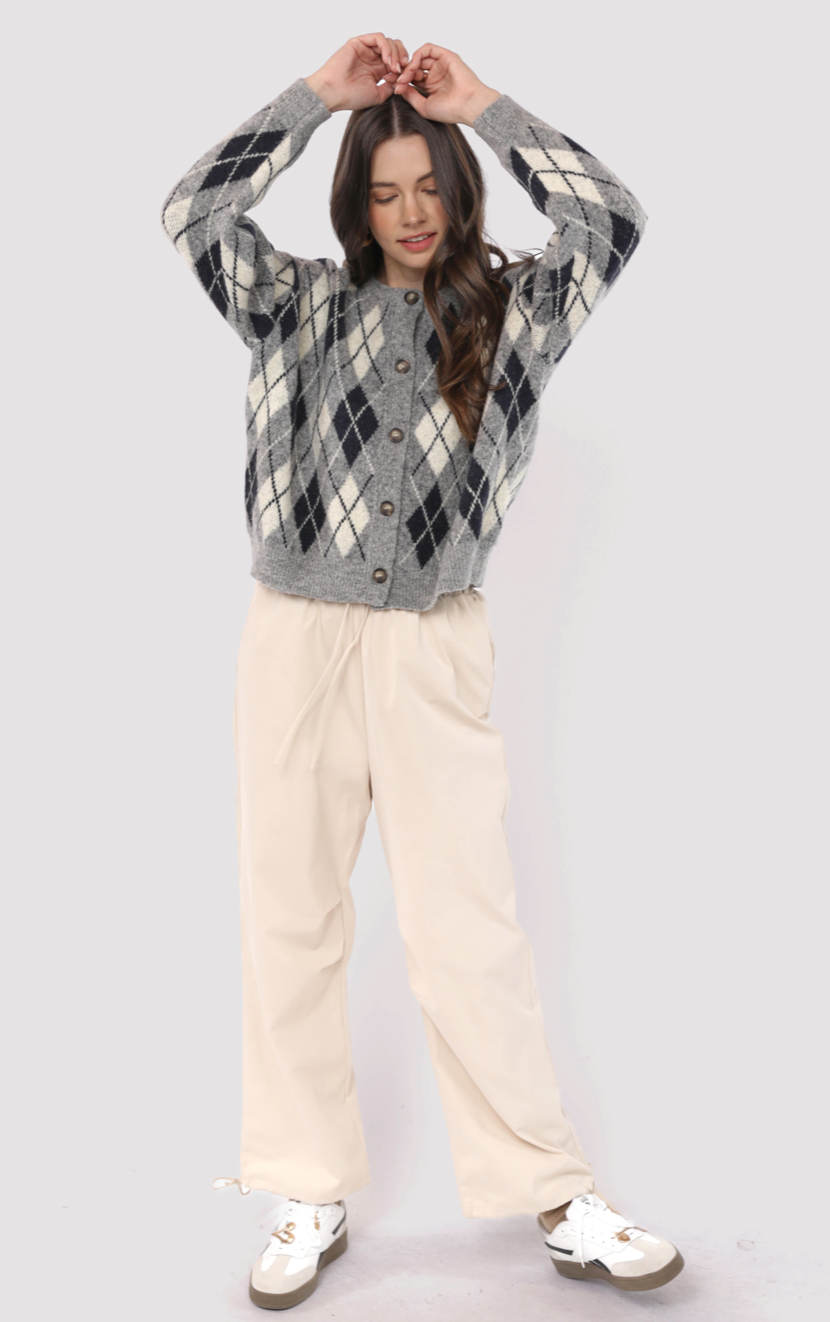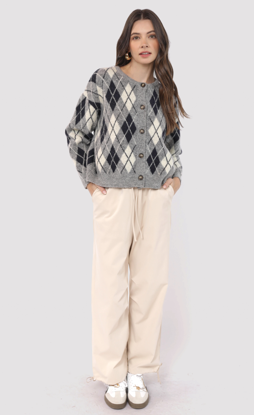 Cozy up in the Bec Sweater, where classic grey and black argyle patterns meet a fun, playful vibe. Perfect for adding a little charm to chilly days, this sweater brings timeless style with a wink. Whether you're out with friends or lounging at home, it’s your go-to for warmth and personality.