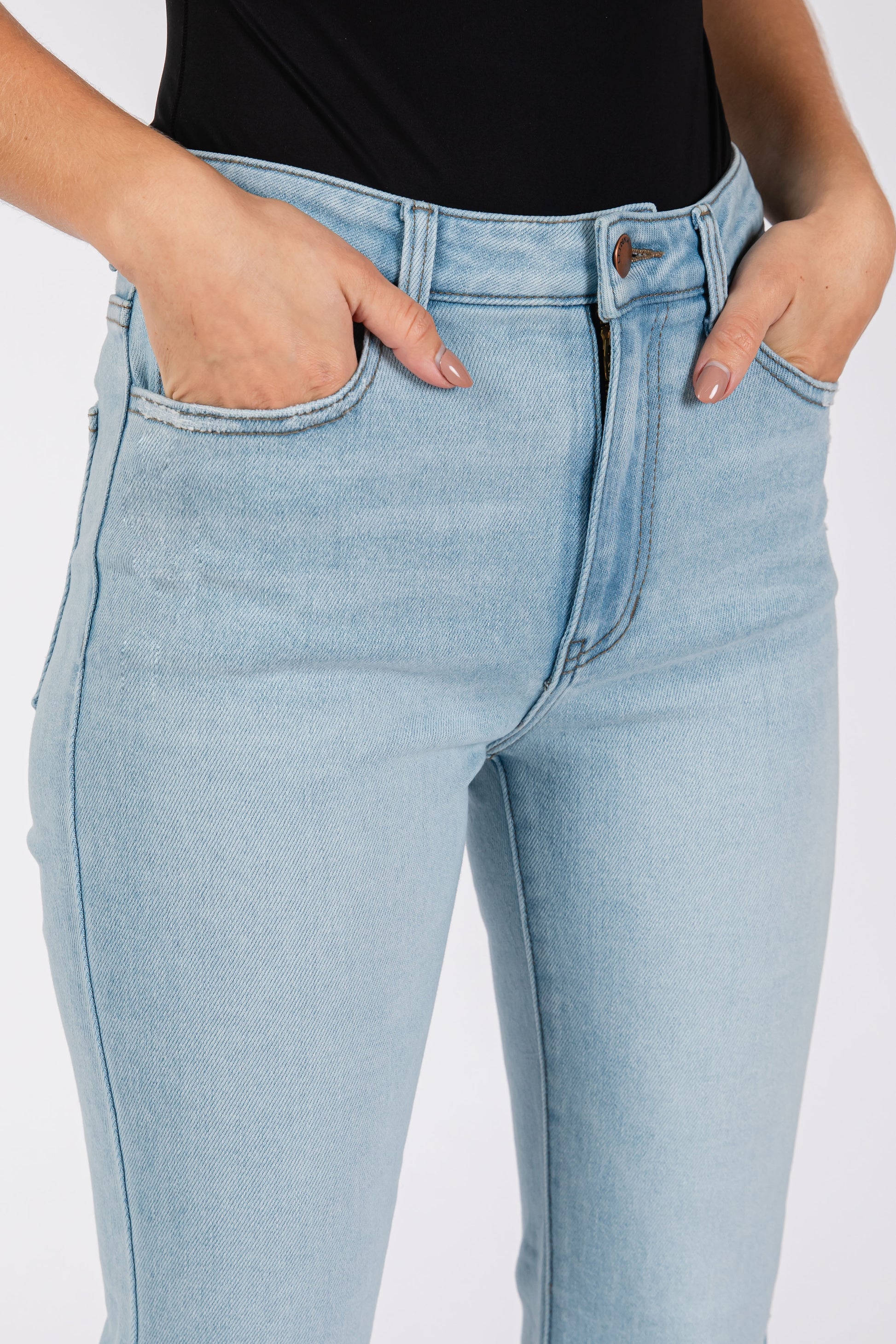 Introducing the Bella Pant - the perfect combination of style and comfort. With a light wash and skinny flare design, these pants are sure to make a statement. Lighten up your wardrobe and add some flare with the Bella Pant. (Pun intended.)