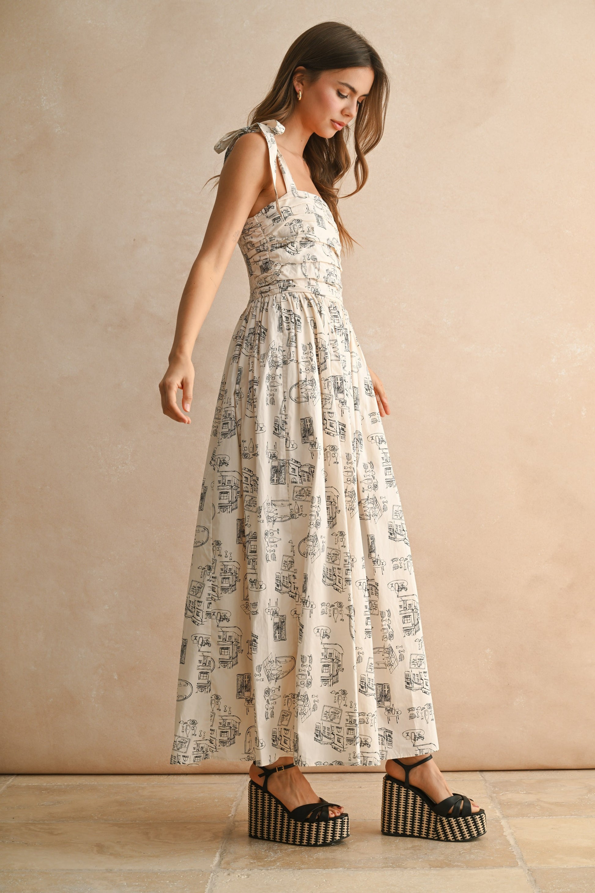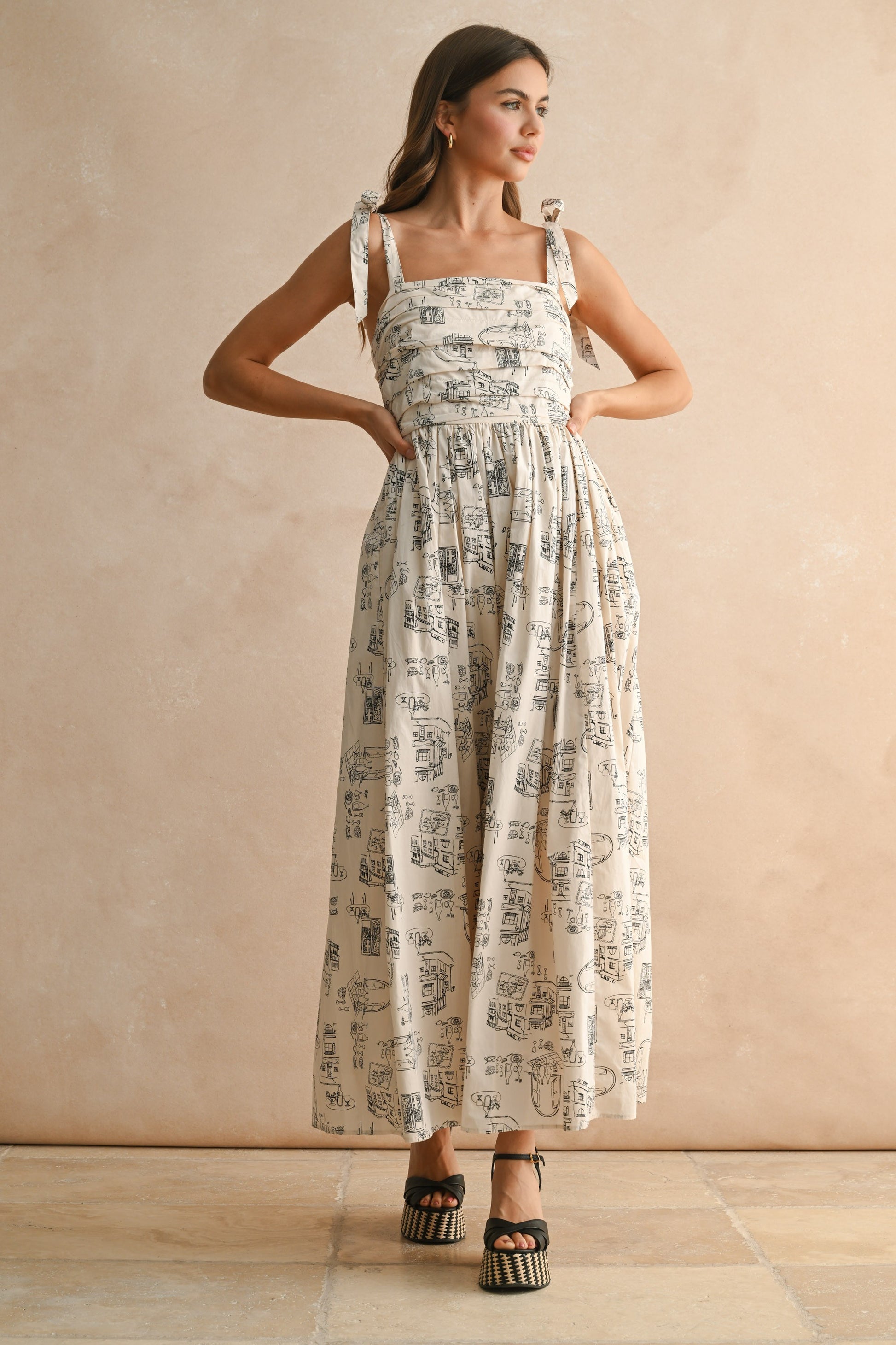 This ecru cotton maxi dress features a charming café-inspired pattern and playful tie straps that offer a perfect fit. Its breathable fabric keeps you comfy all day, making it an ideal choice for sunny outings or relaxed gatherings. Embrace effortless style with this breezy, bra-friendly design that moves with you.