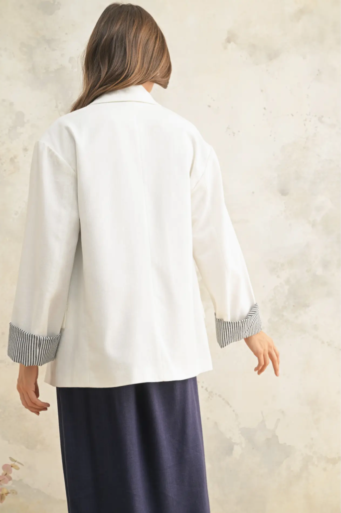 The Charley Blazer combines timeless elegance with modern sophistication. This crisp white blazer features distinctive navy pin stripe detailing along the cuffs, adding a polished touch perfect for both professional settings and elevated casual wear. Tailored for a refined silhouette, it pairs effortlessly with dress pants, skirts, or jeans. An essential layering piece that transitions seamlessly from office to evening occasions.