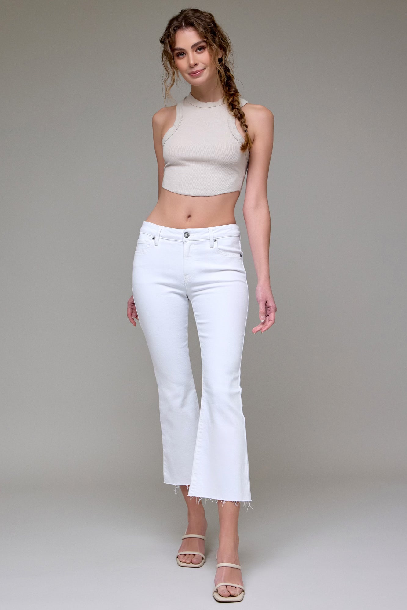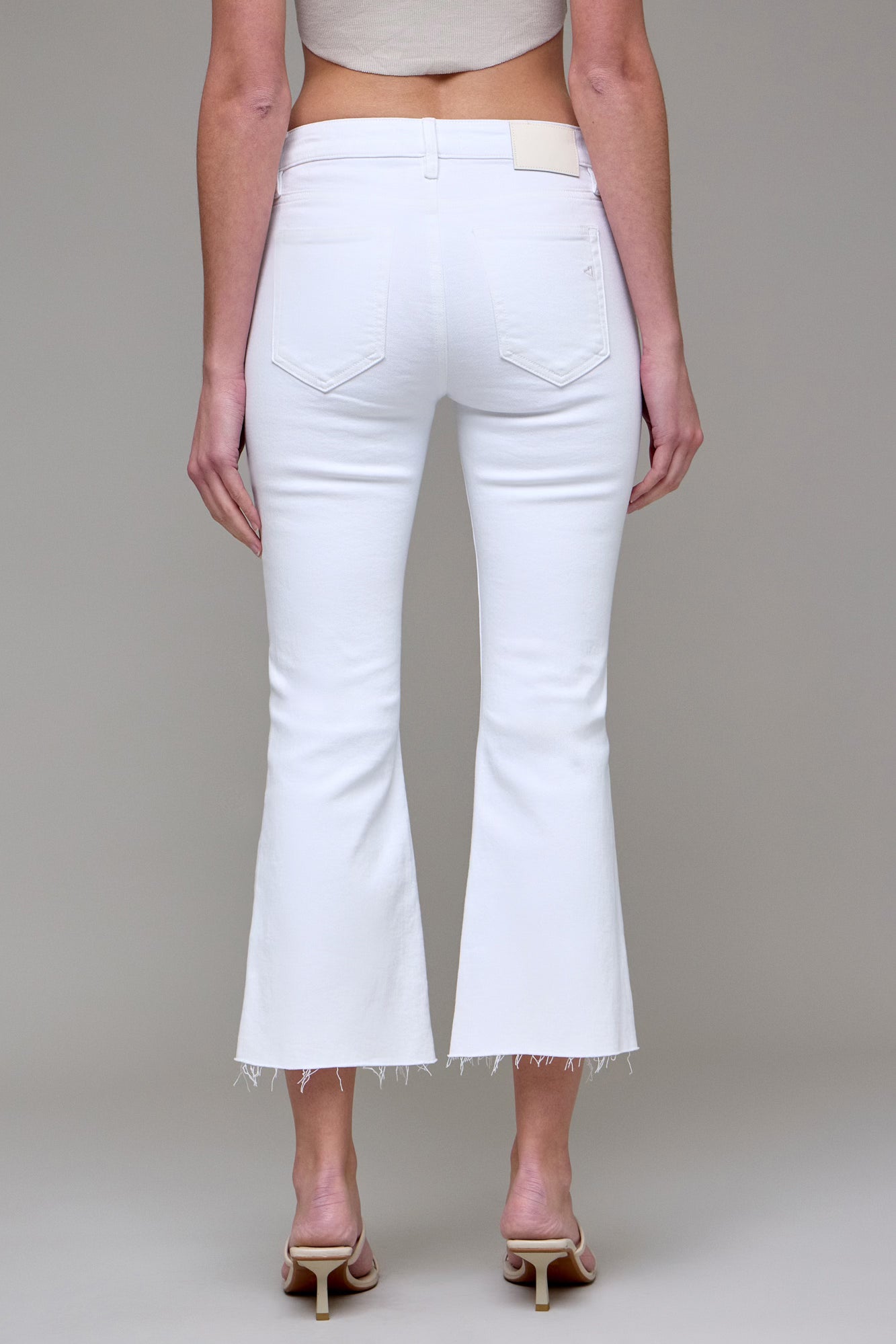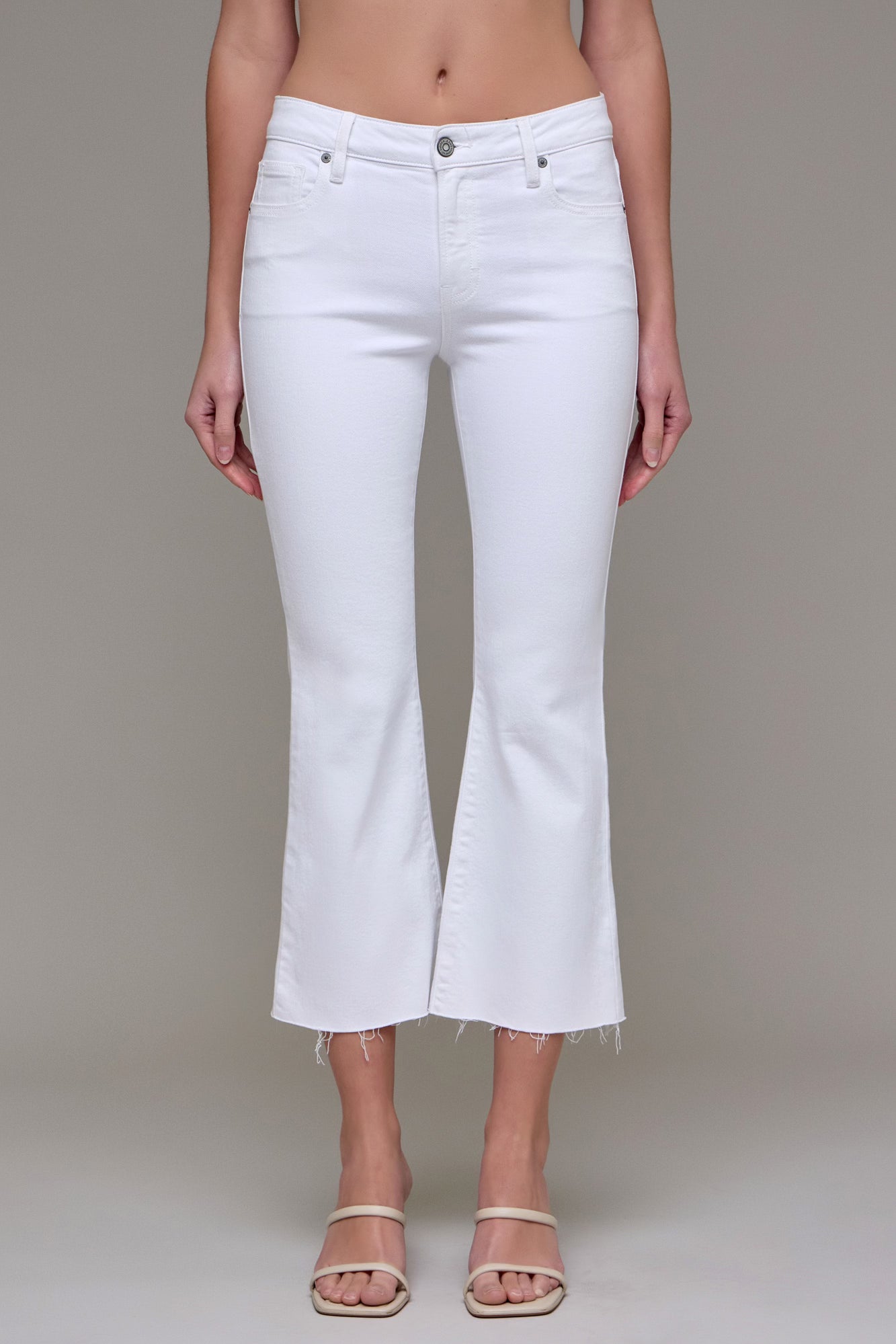 These mid rise crop flare jeans in crisp white denim are your ticket to happy-go-lucky style! With a flattering waistline and playful flared hem that shows off your favorite footwear, they're the perfect blank canvas for creating countless summer looks. Strut your stuff with a clean-cut silhouette that brings all the good vibes!