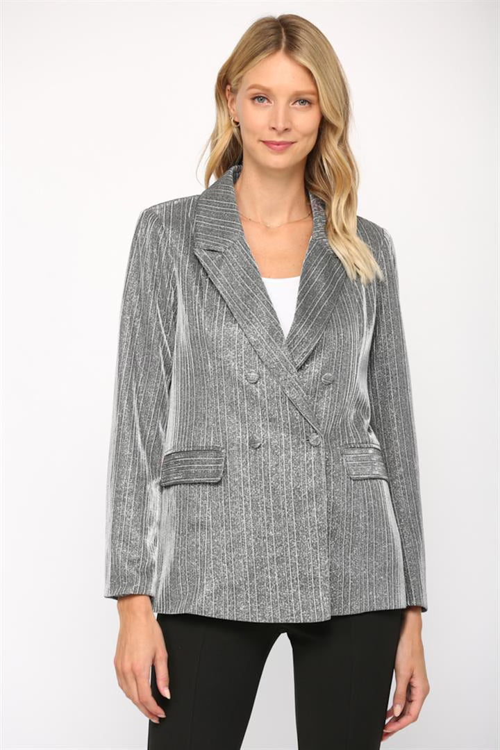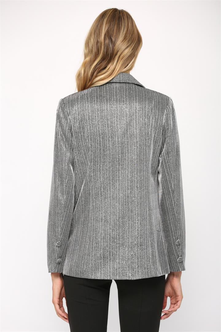 Elevate any outfit with the Dina Blazer - a shimmering chrome blazer that adds a touch of glam to your look. Perfect for a night out or a special event, this blazer will make you shine like the star you are. Upgrade your wardrobe with this statement piece.