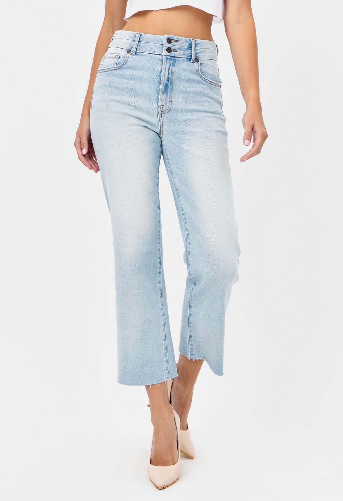 Introducing the Ella Double Band Crop Denim, the perfect addition to your wardrobe. Made from light wash stretch denim, these straight leg jeans offer both comfort and style with a 26" length. Upgrade your denim game today.
