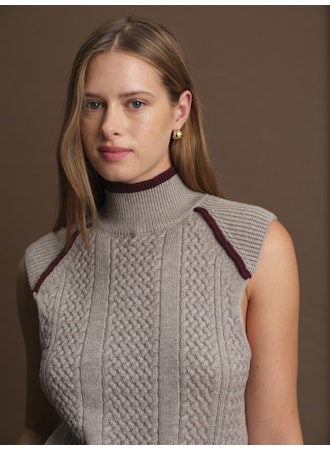 Cozy meets cool in this grey knit vest featuring striking wine-colored piping that adds a pop of playful charm. Perfect for layering over your favorite turtle neck, it brings warmth and style in one easy piece. Embrace a fun twist on classic comfort with this effortlessly chic vest.