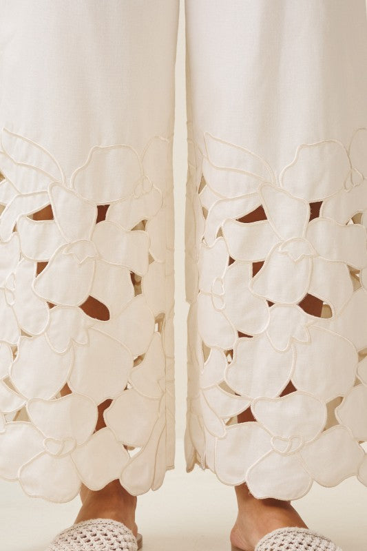 Effortlessly chic meets comfort in the Judy Pant. Crafted from breathable linen, these relaxed-fit trousers feature a charming tie waist for an adjustable, flattering silhouette. Delicate embroidered eyelet details add a whimsical touch that elevates any outfit from casual to polished. Perfect for warm weather adventures or laid-back days when you want to look put-together without trying too hard.