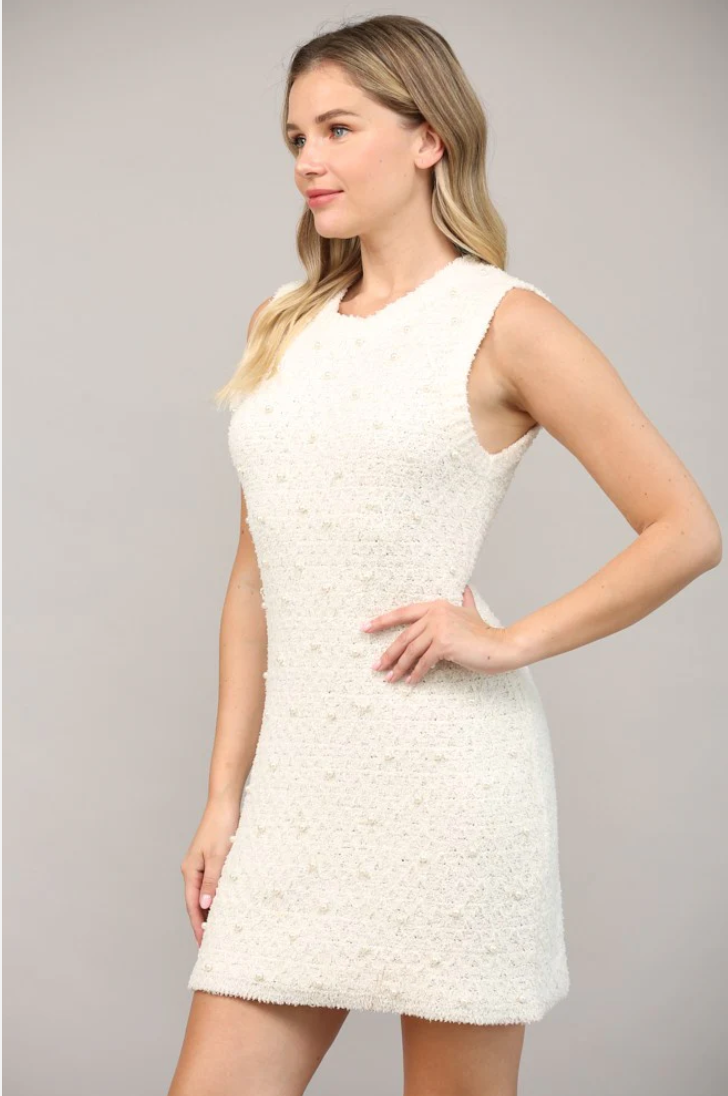 Get ready to shine and turn heads in the Katie Dress. This stunning pearl embellished dress is perfect for any special occasion, adding a touch of elegance to your wardrobe. With its sleeveless design and cozy sweater material, you'll be looking stylish and feeling comfortable all at once. Don't miss out on this must-have piece!