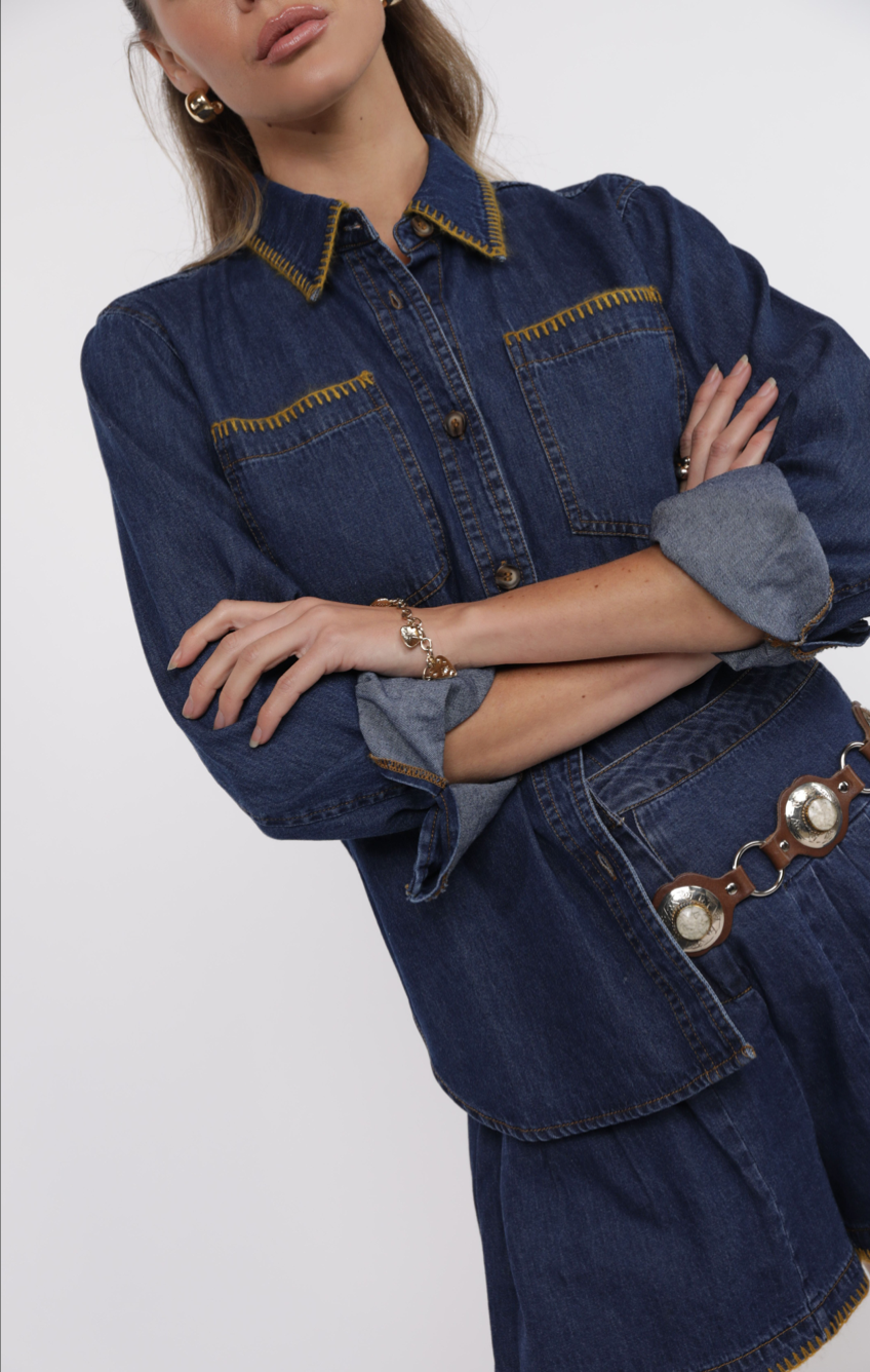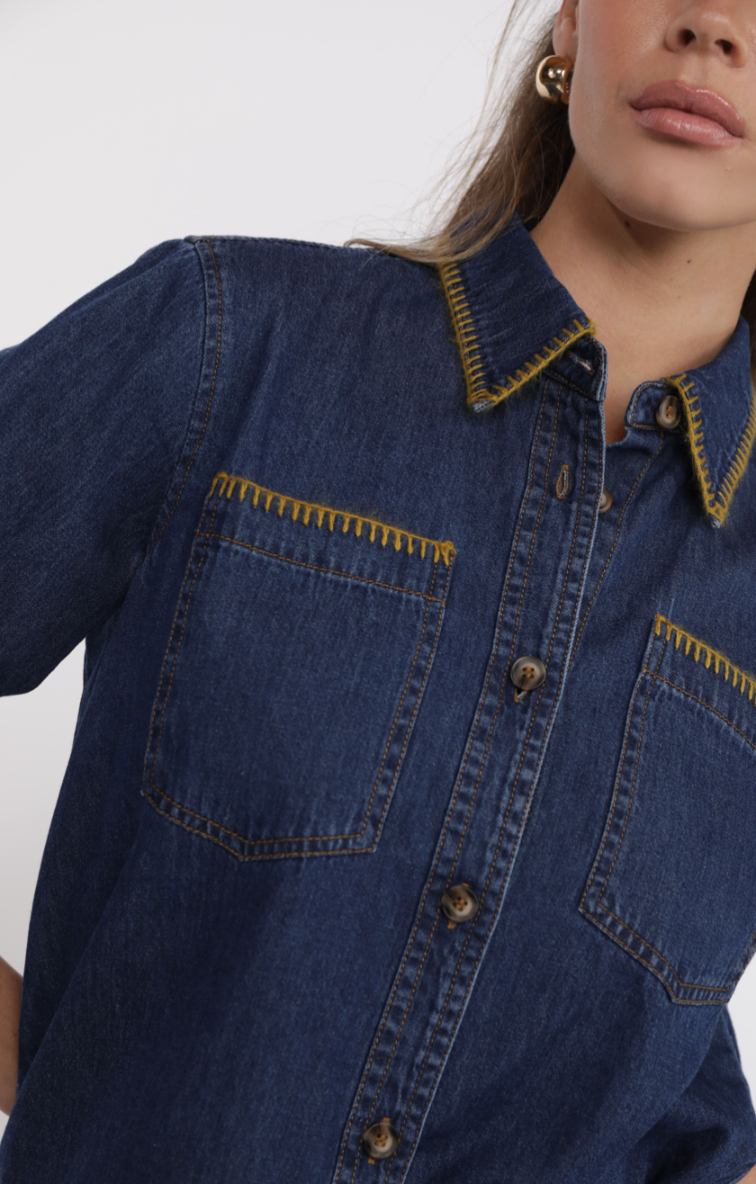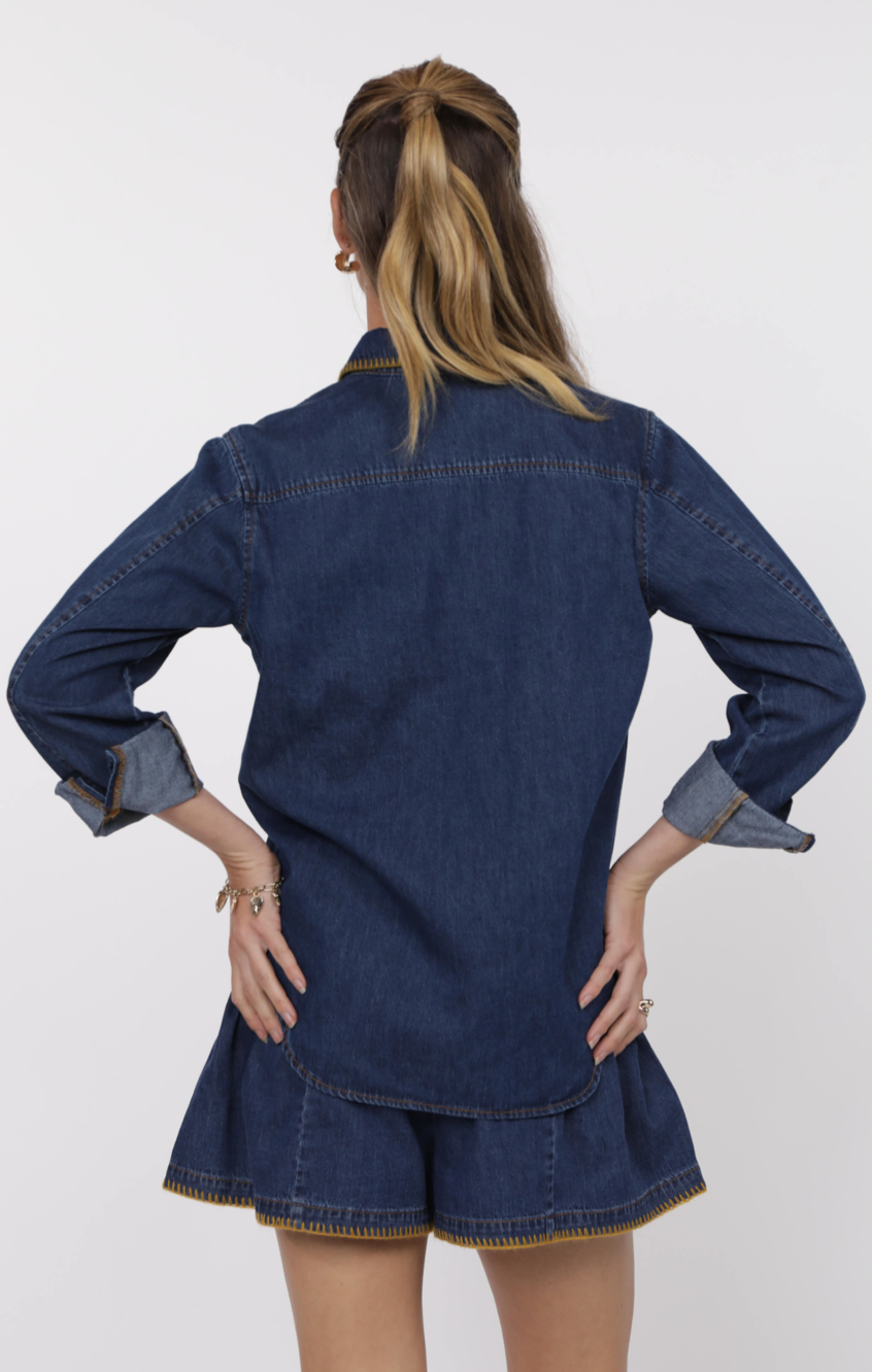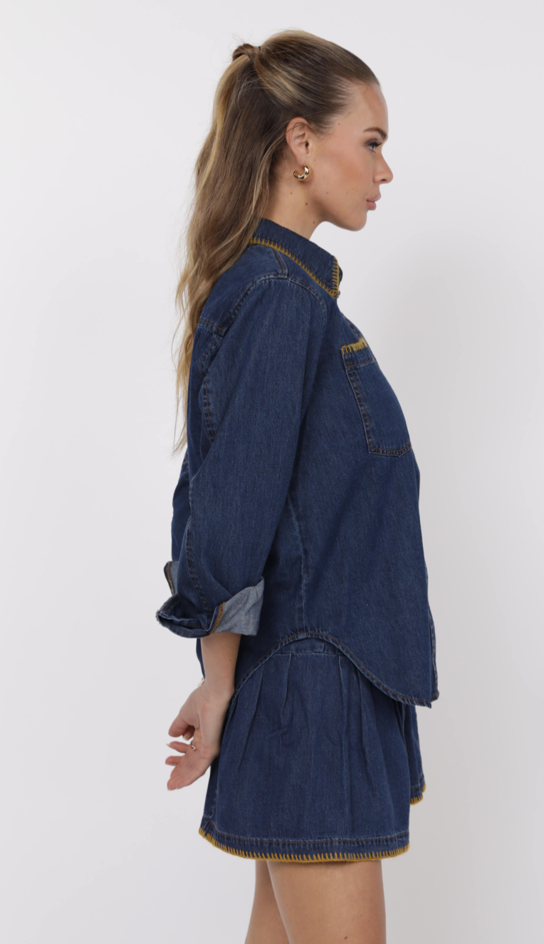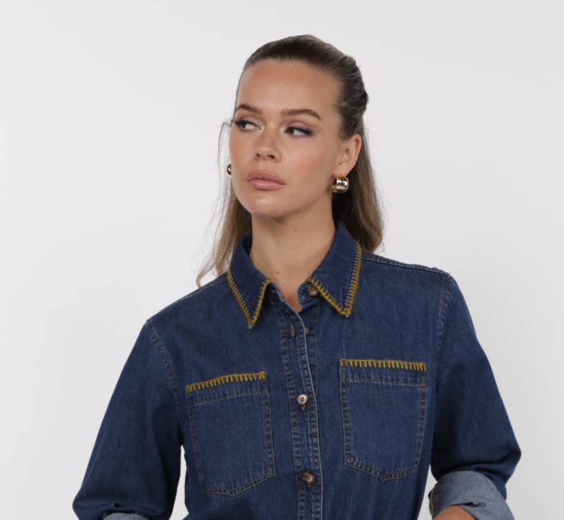 Bring some fun to your wardrobe with the Maggs Denim Top. This dark denim button-down features eye-catching mustard stitching that adds a quirky twist to a classic look. Perfect for casual days when you want to stand out just a little, it pairs effortlessly with your favorite jeans or a skirt for playful, laid-back style.