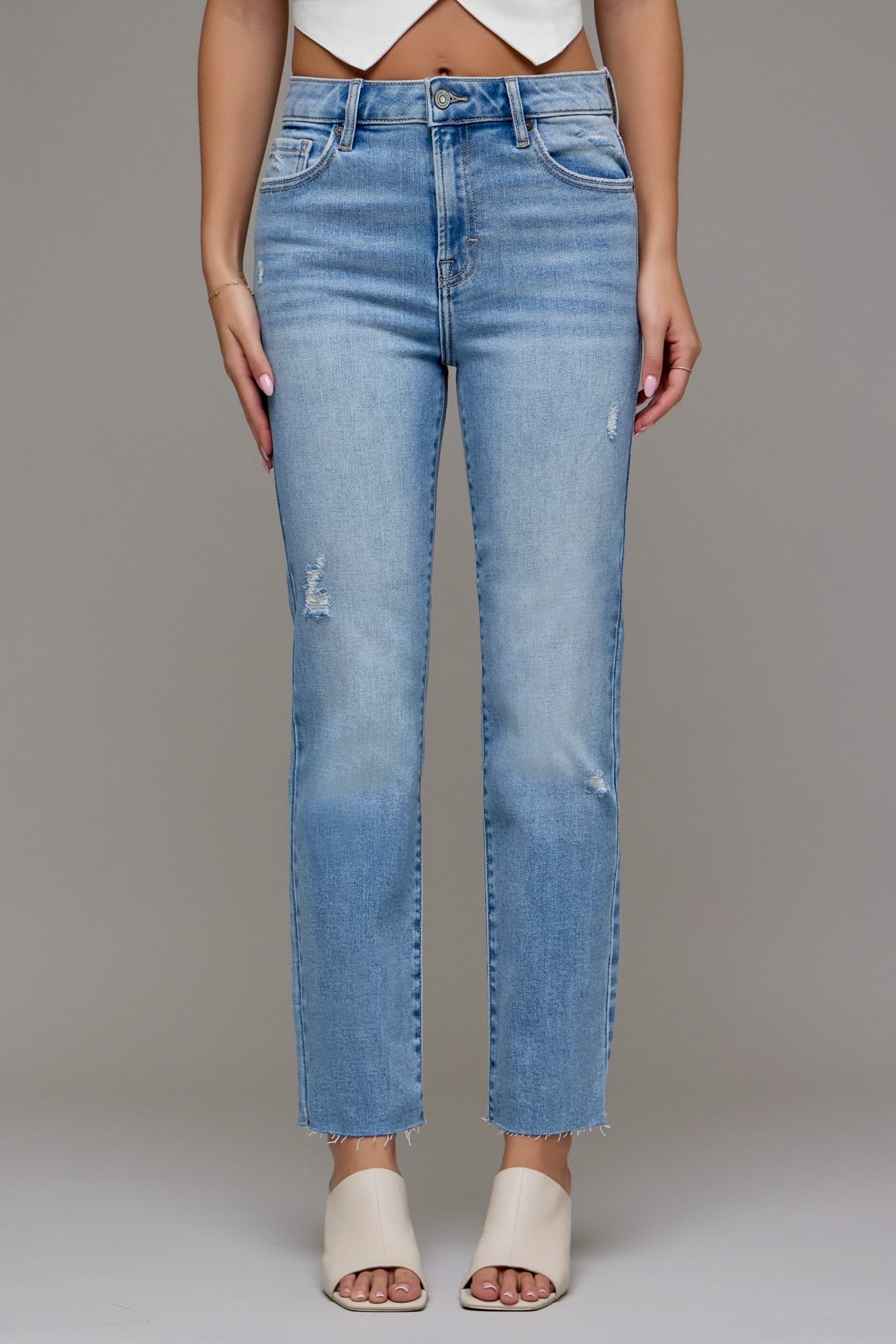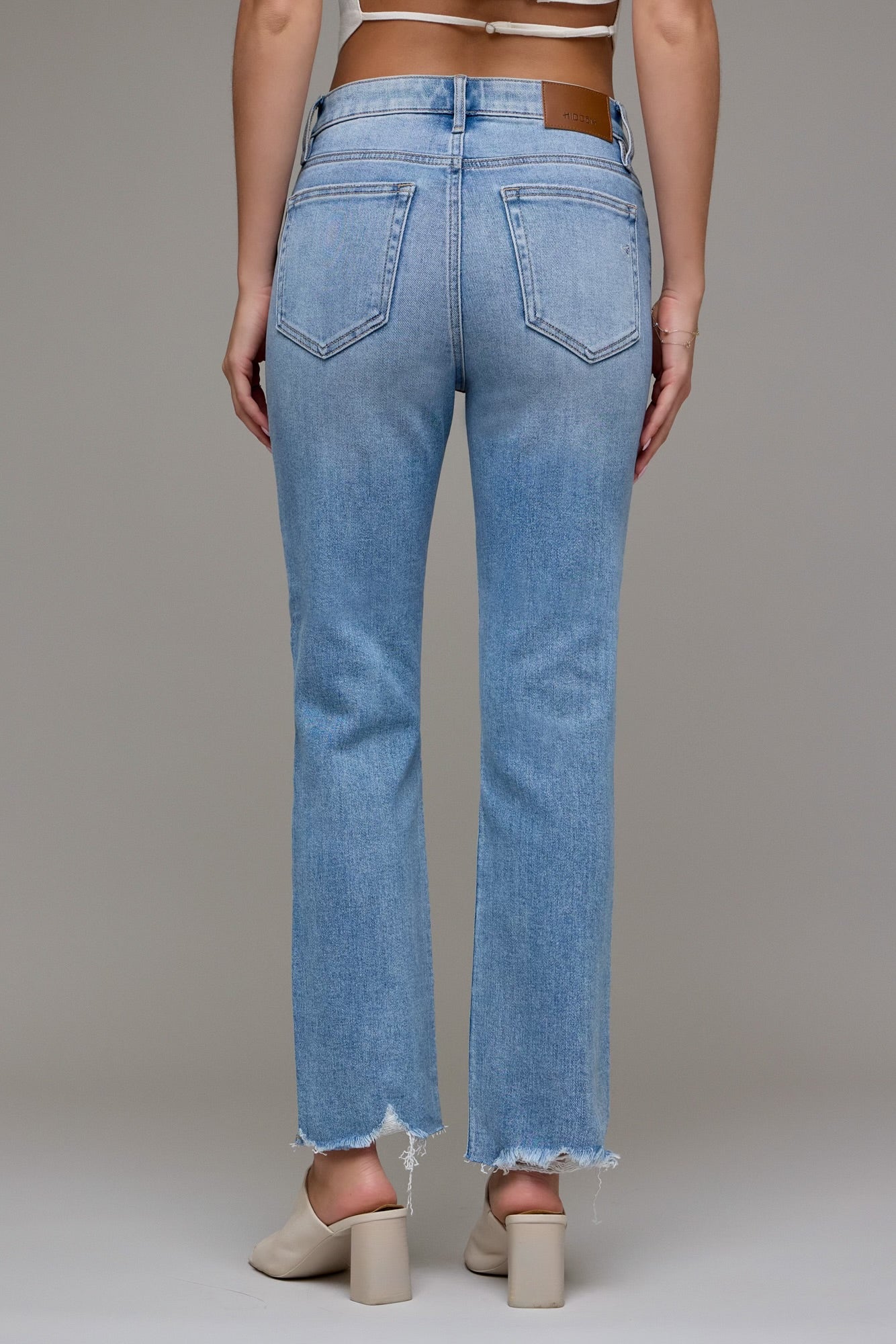"Get ready to light up the town in Quinn - our high rise cigarette slim denim. With minor distressing at the hem, these jeans have a subtle edge that will elevate any outfit. Don't forget to strike a pose!"