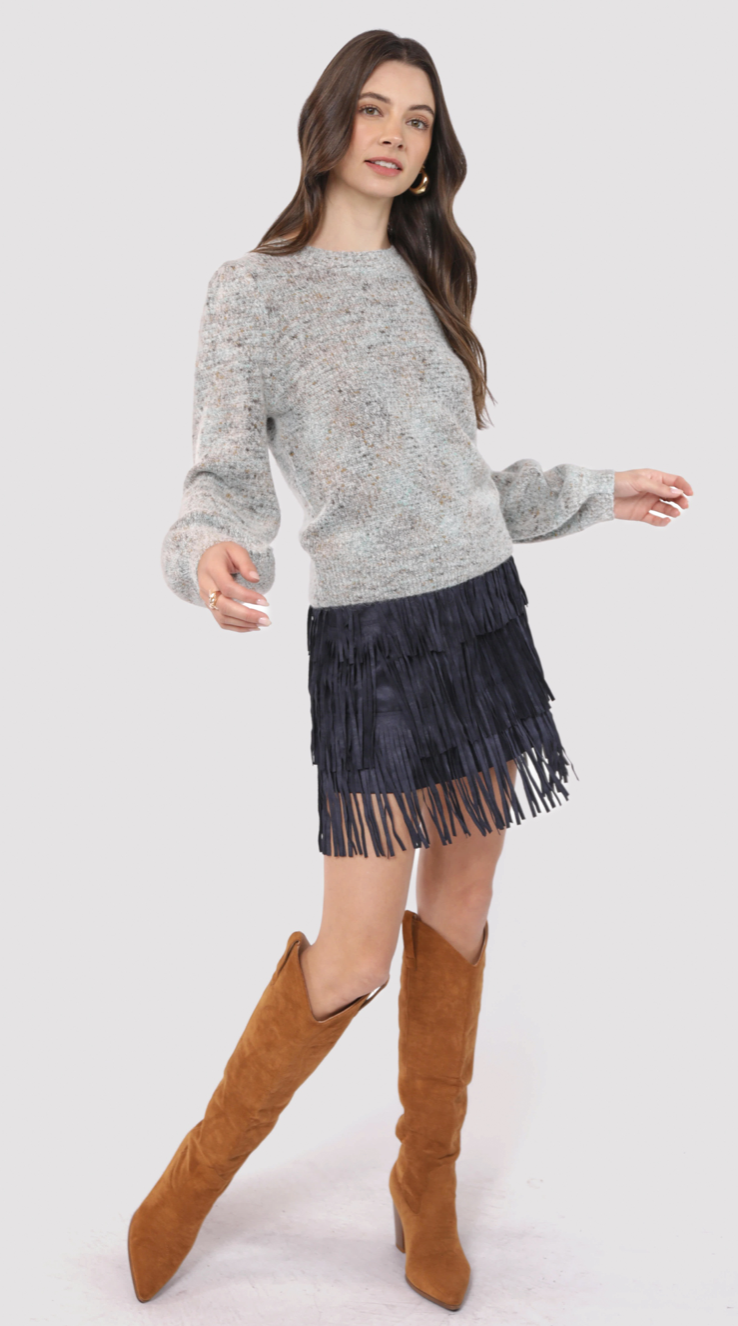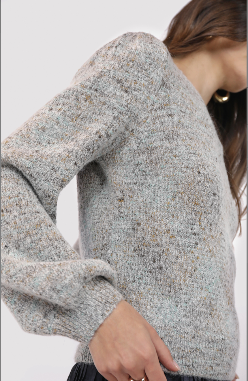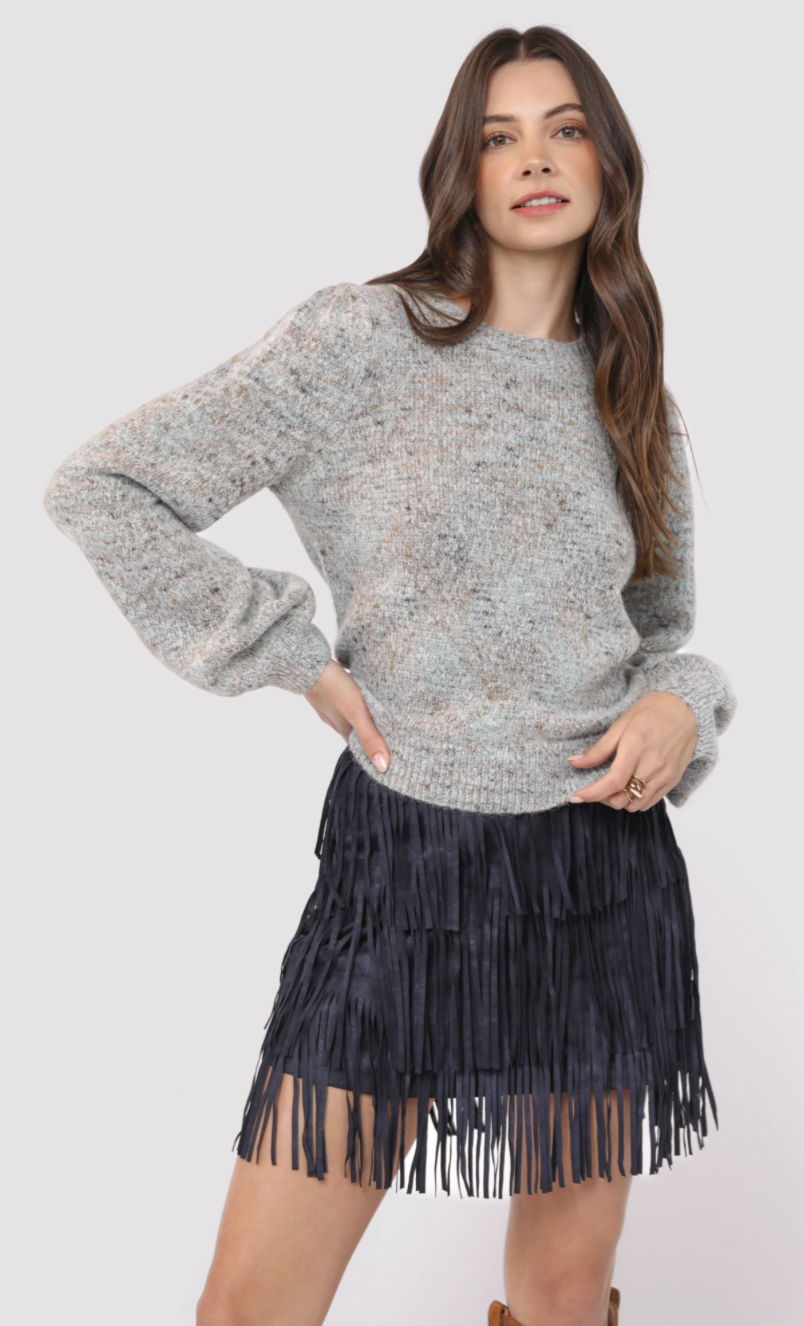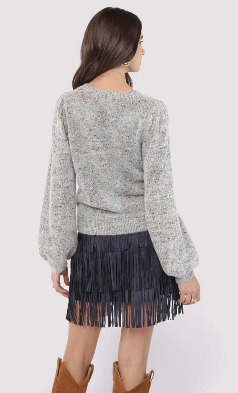 The Shauna Sweater brings a splash of fun to your wardrobe with its light blue space-dyed knit and charming bubble sleeves. Cozy yet playful, it adds a swirl of color and a touch of whimsy to your everyday look. Perfect for days when you want comfort with a quirky twist.
